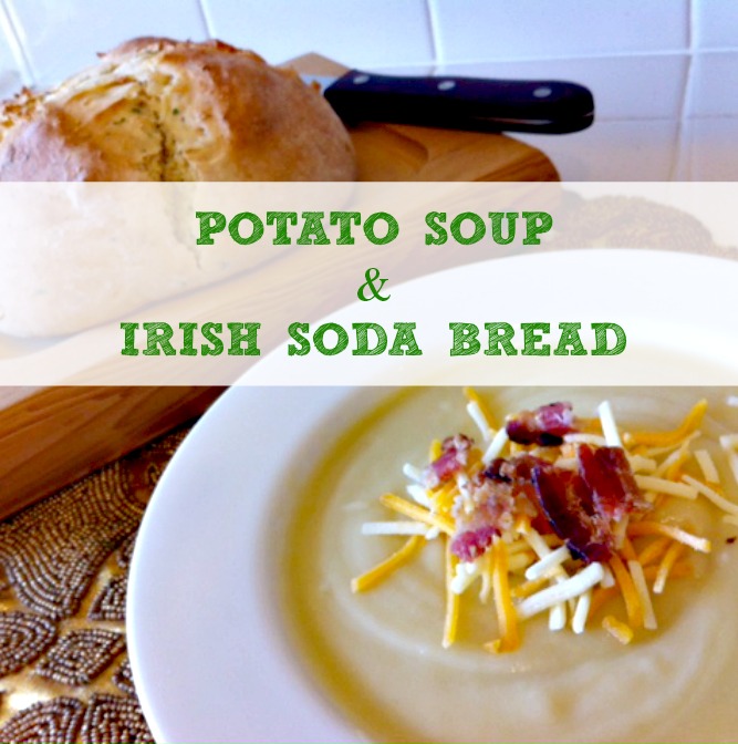 St. Patty’s day is coming quick, and what better way to celebrate than with some hearty grub!  I’m not much of a corned beef fan, which is the traditional St. Patrick’s Day meal in my family, so this Potato Soup recipe is a good alternative for a celebratory meal.  The other plus?  This soup is super creamy, but requires no actual cream – so it’s a tad healthier than your traditional potato soup recipes.  And what good is soup without some crusty, yummy bread to dip in it?  This Irish Soda bread is awesome as it is super easy to make and very flavorful.