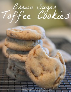 This weekend we had a picnic in the park with family and we were charged with bringing dessert. To keep things easy, Mom settled on their scrumptious brown sugar toffee cookies. They’re kind of like a snickerdoodle, but with yummy bits of toffee and a whole lot more flavor. The other thing I liked about these is they weren’t too sugary – which means you can eat a whole lot of them without even knowing it! 🙂
