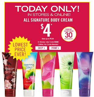 Today only Bath & Body Works is offering their Signature Body Cream for just $4 each!  That’s a savings of $8.50 per bottle, so this is a really good deal.  This deal is actually the best if you shop online because we have an additional 20% off Bath & Body Works coupon code which drops the price to just $3.20 per bottle!